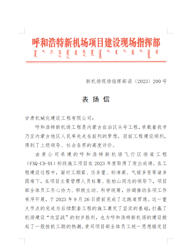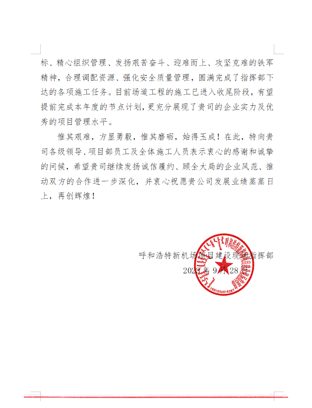 2023年9月28日,呼和浩特新機場項目建設(shè)現(xiàn)場指揮部給我司發(fā)來表揚信,信中充分肯定了我司在呼和浩特新機場項目建設(shè)中項目部全體員工統(tǒng)一思想錨定目標(biāo)、精心組織管理、發(fā)揚艱苦奮斗、迎難而上、攻堅克難的鐵軍精神,合理調(diào)配資源、強化安全質(zhì)量管理,圓滿完成了指揮部下達(dá)的各項施工任務(wù)。