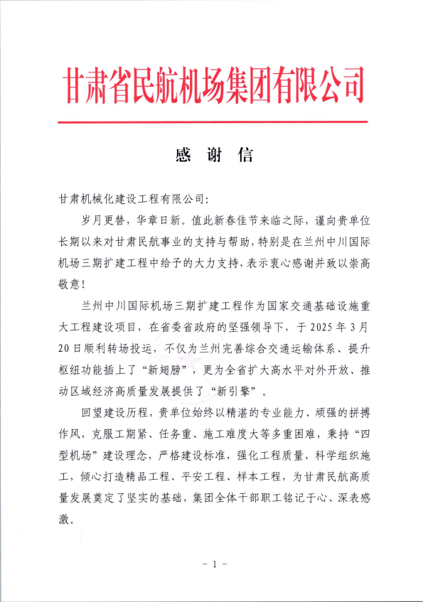 近日,我司接連收到甘肅省民航機(jī)場(chǎng)集團(tuán)、湖南機(jī)場(chǎng)建設(shè)指揮部發(fā)來(lái)的感謝信,對(duì)我司在蘭州中川國(guó)際機(jī)場(chǎng)三期擴(kuò)建工程、長(zhǎng)沙機(jī)場(chǎng)改擴(kuò)建工程中的突出表現(xiàn)給予高度評(píng)價(jià)與誠(chéng)摯感謝。