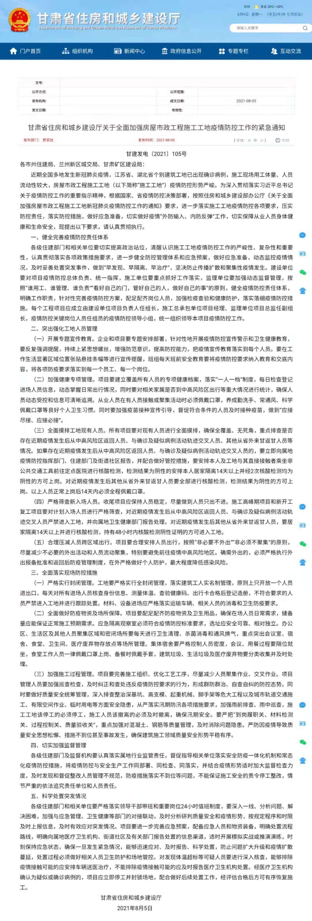 為深入貫徹落實習(xí)近平總書記關(guān)于疫情防控工作的重要指示精神,根據(jù)國家、省疫情防控決策部署,按照住房和城鄉(xiāng)建設(shè)部辦公廳《關(guān)于全面加強(qiáng)房屋市政工程施工工地新冠肺炎疫情防控工作的通知》要求,確保安全生產(chǎn)和正常施工生產(chǎn)秩序,現(xiàn)將《甘肅省住房和城鄉(xiāng)建設(shè)廳關(guān)于全面加強(qiáng)房屋市政工程施工工地疫情防控工作的緊急通知》轉(zhuǎn)發(fā)給你們,請各單位遵照執(zhí)行。