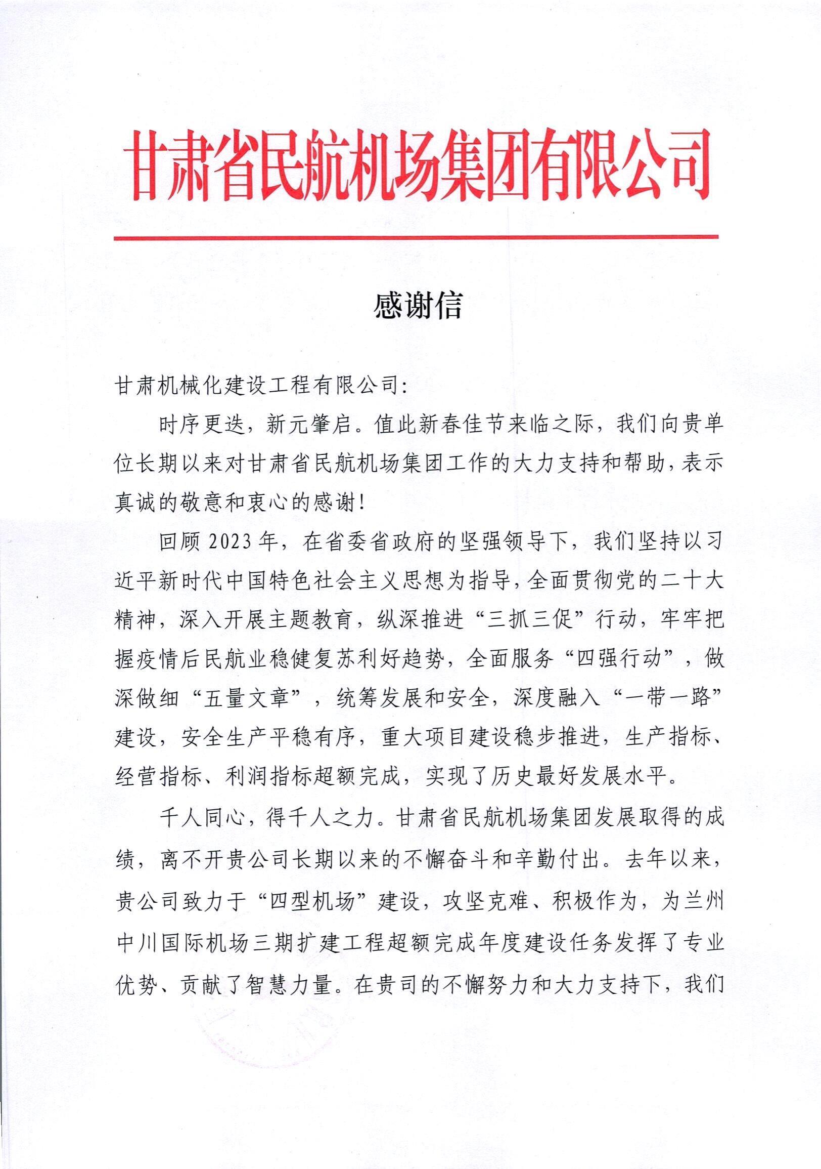 2月8日,新春佳節(jié)來臨之際,我司收到來自甘肅省民航機(jī)場集團(tuán)有限公司的感謝信。